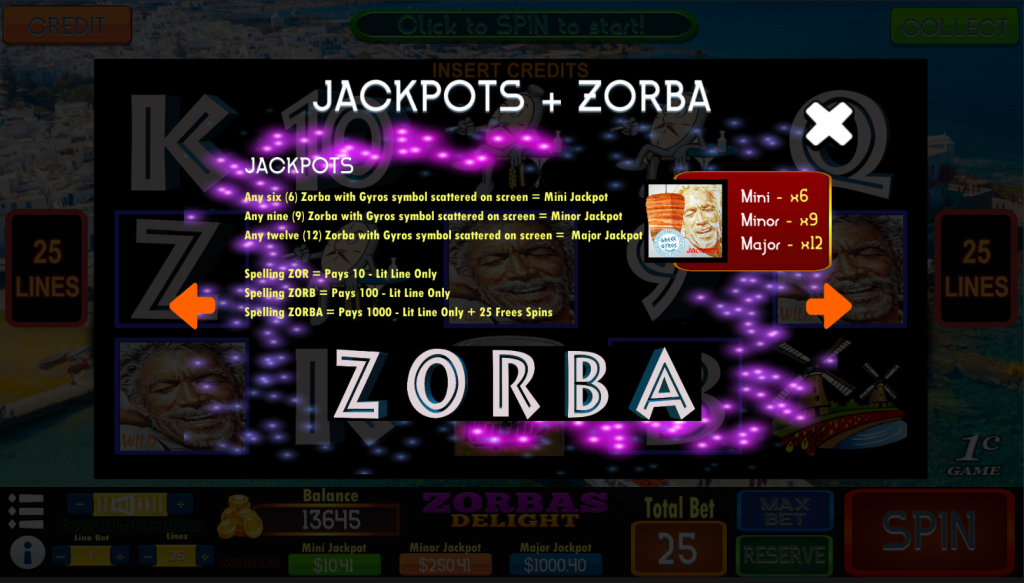 Zorbas Delight is a 5 reel, 25 payline slot machine (pokie) with a Zorba Dance and Greek theme oriented from left to right. Play this classic that feels likes you are playing slots on a island of Greece.